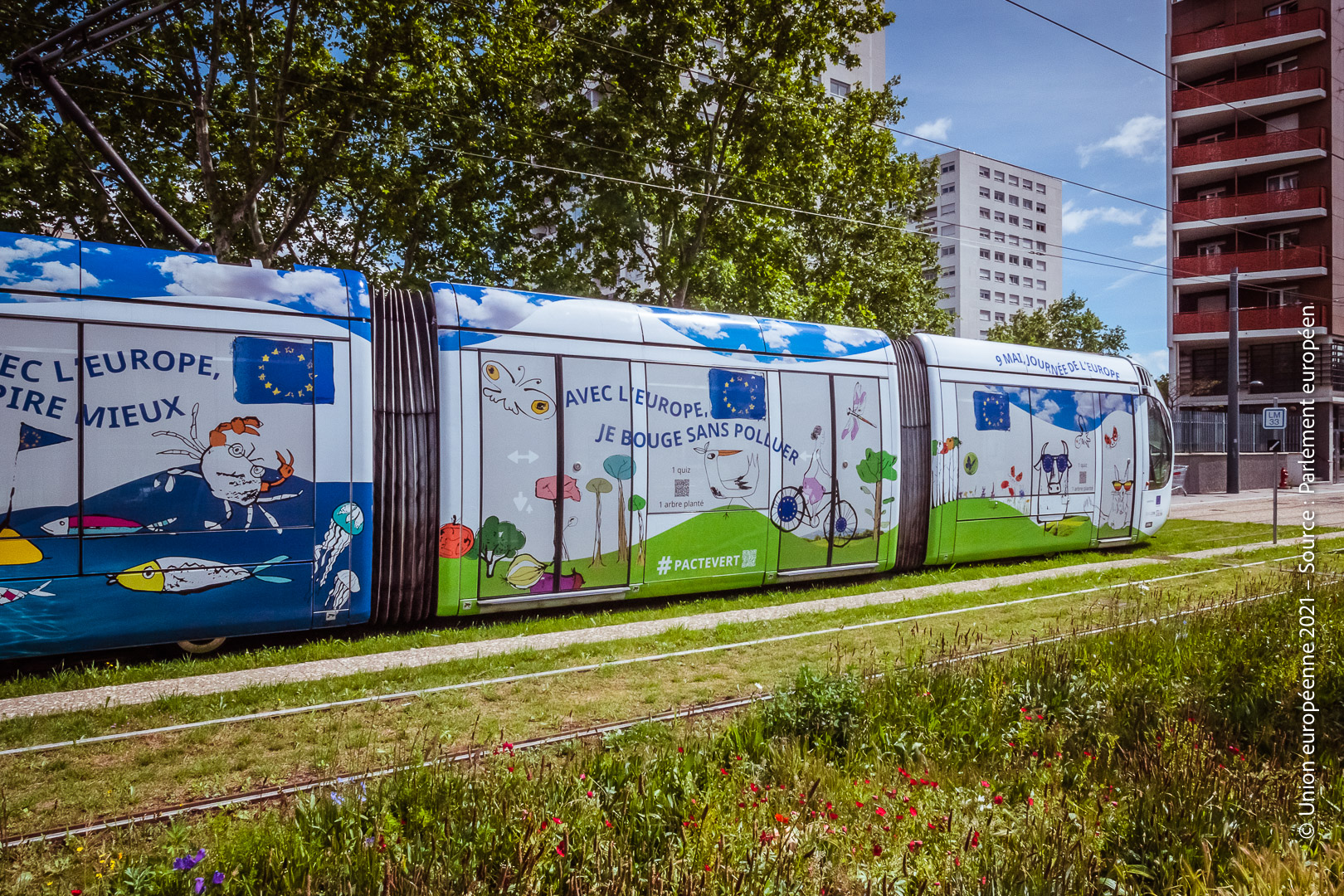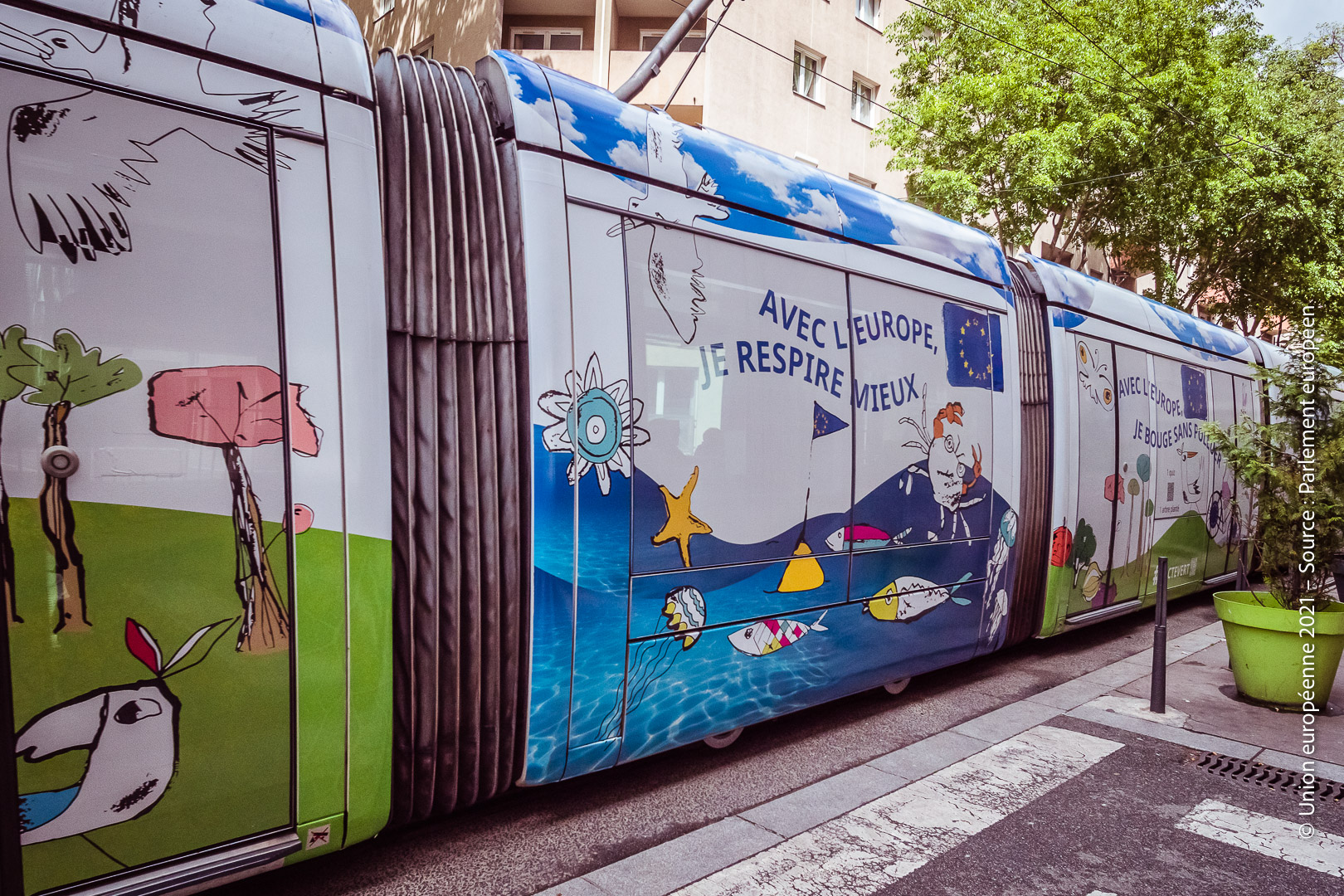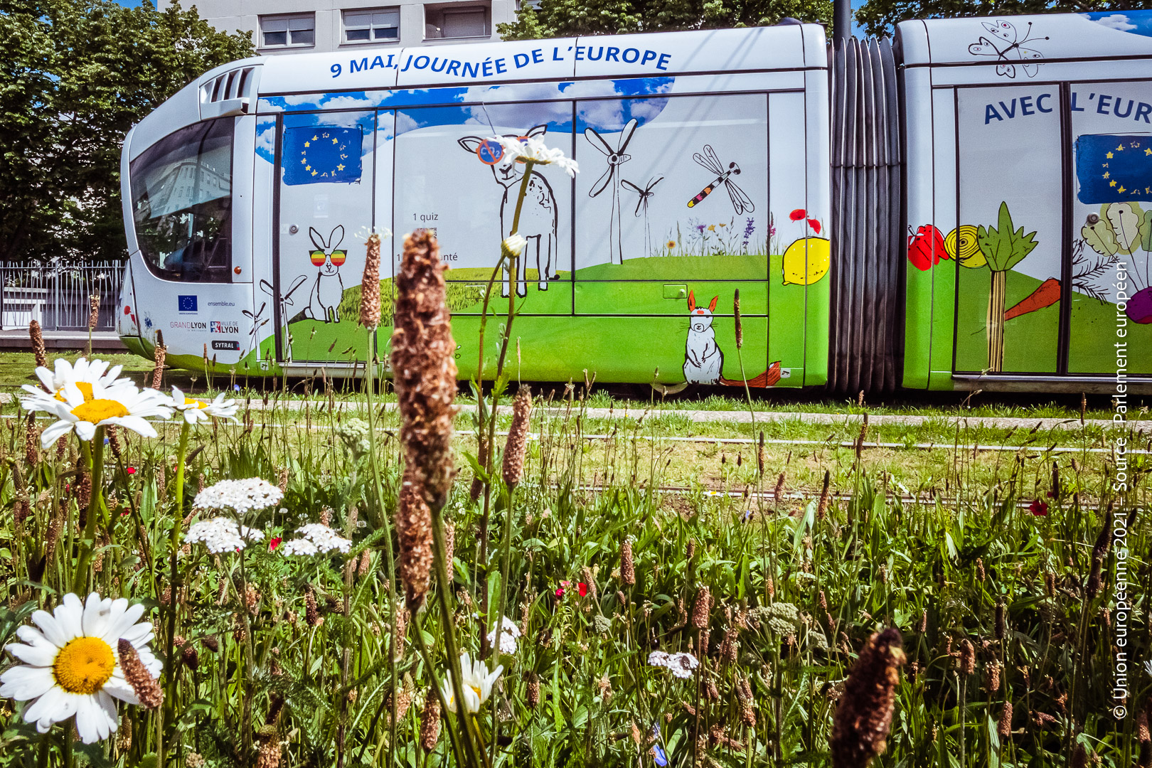 Dans le cadre du joli mois de l’Europe le tramway de Lyon est décoré aux couleurs du pacte vert de l'Europe.