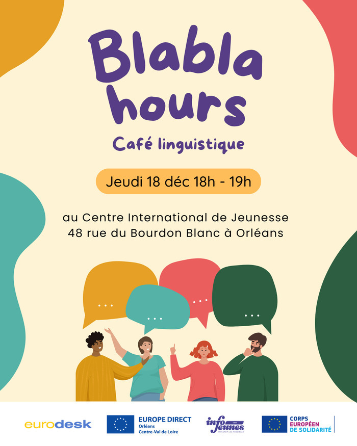 Animé par des volontaires européens, les Blabla hours sont des cafés linguistiques qui ont lieu 1 jeudi par mois. L'objectif est de se rencontrer et d'échanger en langues étrangères dans un cadre convivial ! La langue commune est l'anglais mais il est possible de parler d'autres langues en fonction