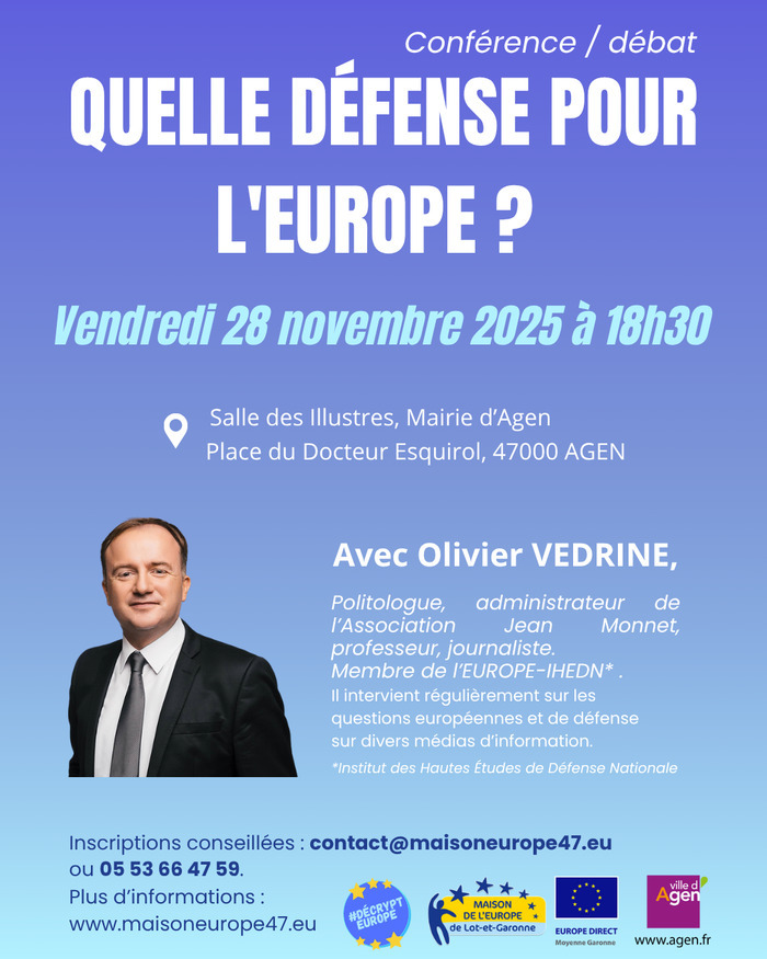 La Maison de l'Europe de Lot-et-Garonne / Europe Direct Moyenne Garonne et la Ville d'Agen ont le plaisir de vous inviter à une conférence / débat : « Quelle défense pour l'Europe ? » 📅 Vendredi 28 novembre 2025 à 18h30 📍 Salle des Illustres, Mairie d’Agen (Place du Docteur Esquirol - 47000 Agen)
