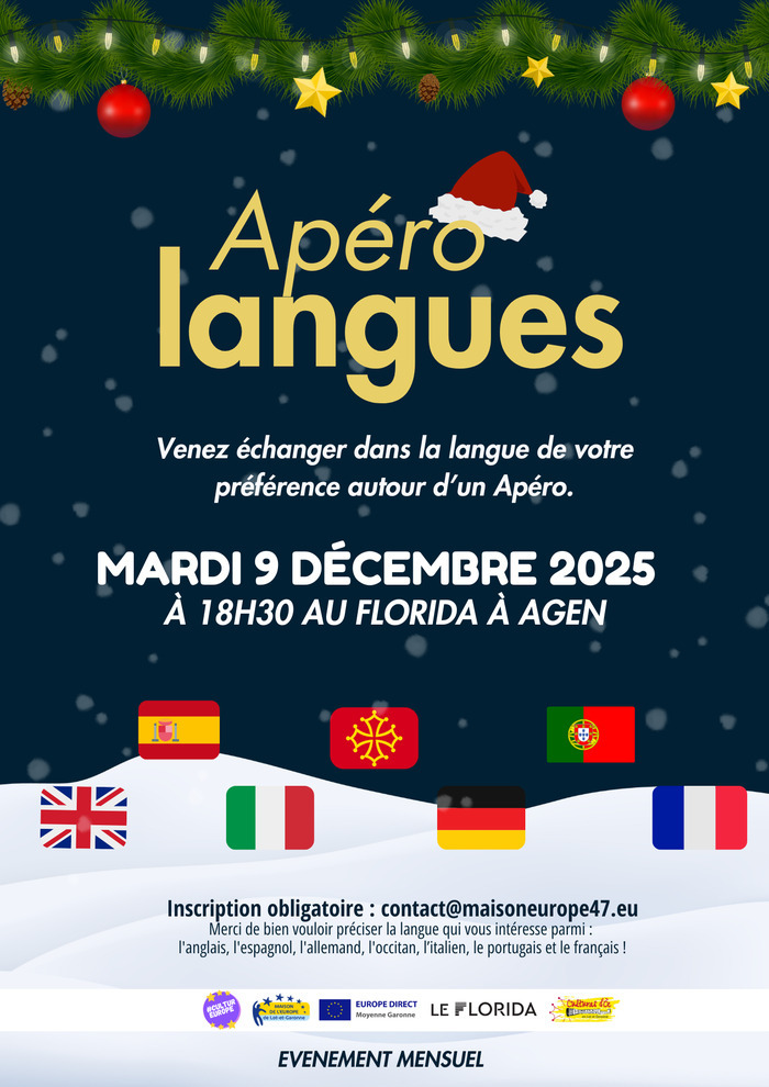 Envie de pratiquer une langue étrangère dans une ambiance conviviale ? Rejoignez-nous pour l’Apéro Langues le mardi 9 décembre à 18h30 au Florida à Agen.