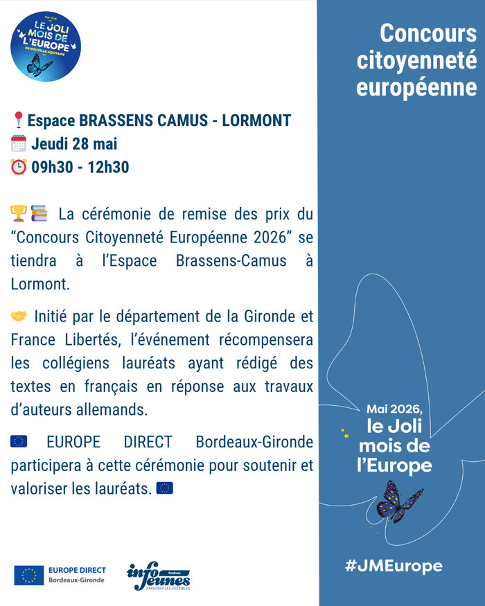 đđ La cĂ©rĂ©monie de remise des prix du âConcours CitoyennetĂ© EuropĂ©enne 2026â se tiendra Ă lâEspace Brassens-Camus Ă Lormont.