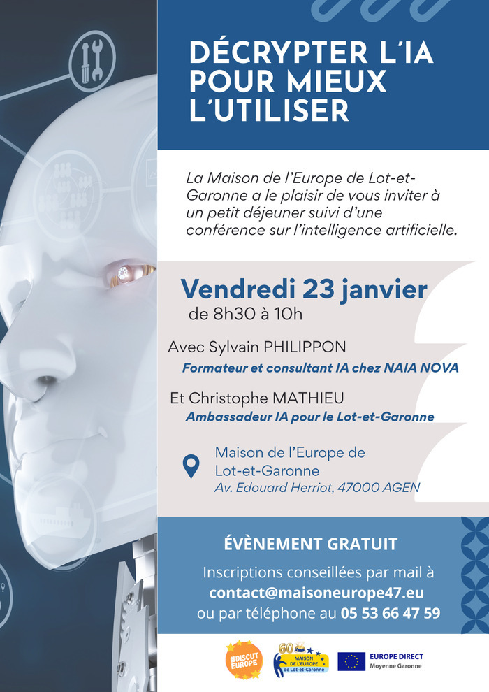 La Maison de l’Europe de Lot-et-Garonne / Europe Direct Moyenne Garonne vous propose un moment convivial pour décrypter l’IA et découvrir ses usages concrets.