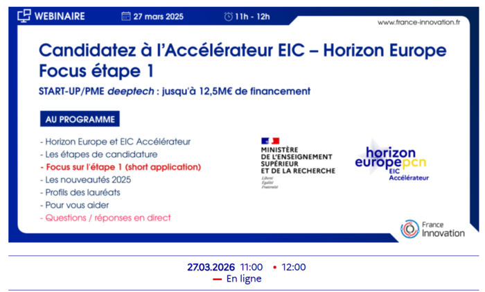 Dans le cadre du programme Horizon Europe, et en lien avec France Innovation, l'équipe du PCN EIC Accélérateur (Point de Contact National pour l’European Innovation Council) organise un **webinaire le 27 Mars 2026** de 11h à 12h.