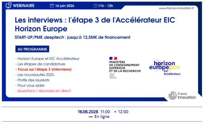 Dans le cadre du programme Horizon Europe et en lien avec France Innovation, l'équipe du Point de Contact National (PCN) pour l’European Innovation Council (EIC) Accélérateur organise son premier **webinaire sur l'étape 3 "Interview" le 16 Juin 2026** entre 11h et 12h.