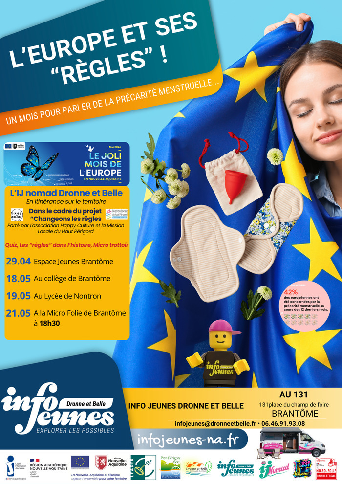 L'info jeunes Dronne et Belle nomad et le 131 mènent des actions de sensibilisation et d'éducation auprès des jeunes pour informer sur la précarité menstruelle durant le joli mois de l'Europe !