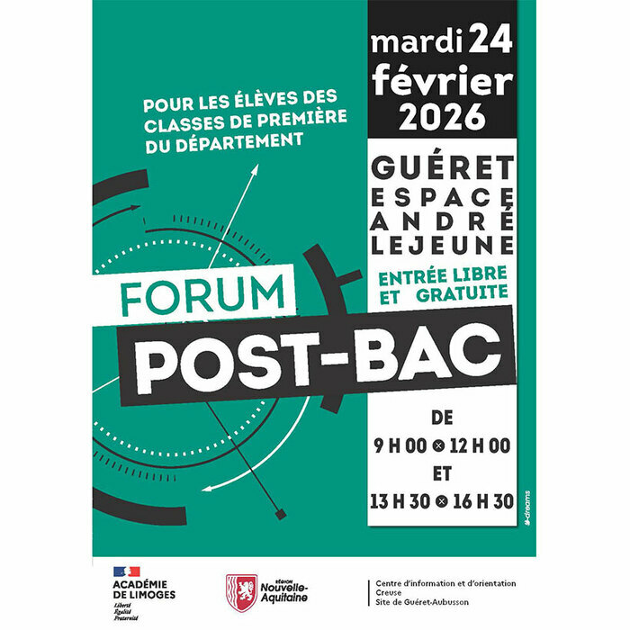 Le « Forum Post-bac » se déroulera à l’Espace André LEJEUNE de Guéret le mardi 24 février 2026, de 09h00-12h00 et de 13h30 à 16h30.