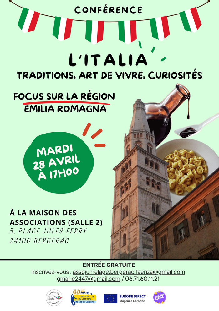 Le mardi 28 avril à 17h, la Maison de l’Europe de Lot-et-Garonne / Europe Direct Moyenne Garonne, en partenariat avec l’Association Bergerac Italia, vous invite à une conférence sur "L’Italia : Traditions, art de vivre, curiosités" avec un focus sur la région Emilia Romagna.