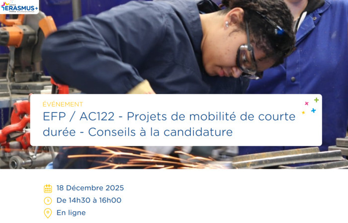 Ce webinaire est destiné aux acteurs de l’Enseignement et de la Formation Professionnels souhaitant candidater à un projet de mobilité de courte durée dans le cadre de l’Appel à propositions 2026.