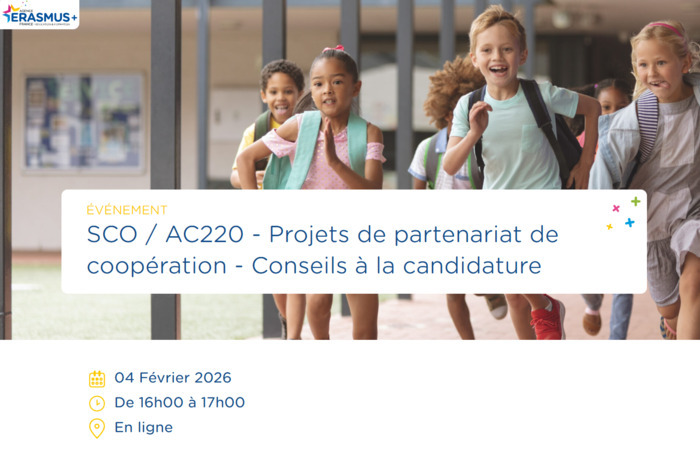 Ce webinaire est destiné aux organismes qui souhaitent candidater à l'appel à projets Erasmus+ 2026 pour un projet de partenariat de coopération dans le domaine de l'enseignement scolaire.