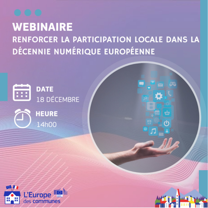 La Représentation de la Commission européenne en France organise, en partenariat avec la DG REGIO et la DG CONNECT, un **webinaire** dédié au **rôle** essentiel des **collectivités territoriales** dans la mise en œuvre de la **Décennie numérique européenne**, dont la **revue stratégique** interviendra en **2026**. Il se déroulera le **18 décembre 2025**, **en ligne** et **en français**.